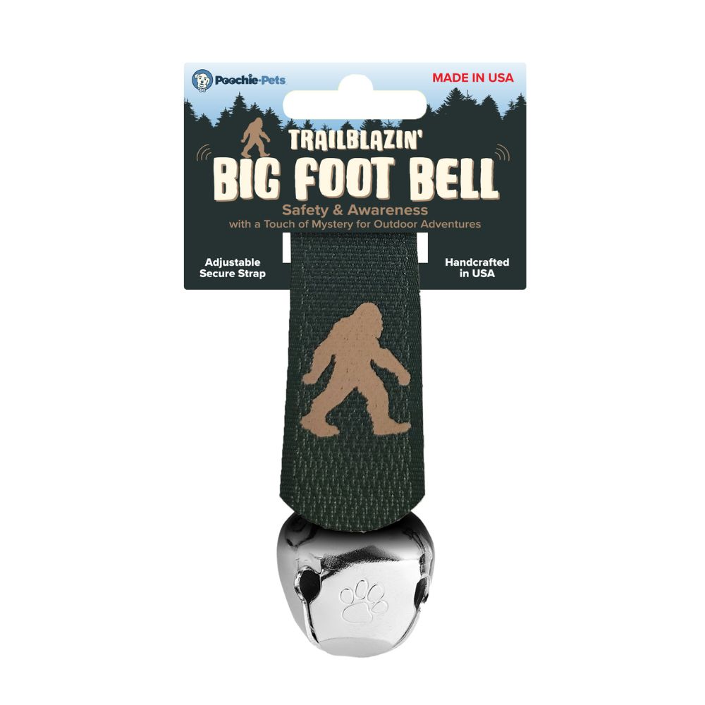 Each bell is inscribed with the Poochie-Pets signature pawprint—synonymous with craftsmanship and trust— bigfoot collar bells are available in large 1.25″ USA silver colored lead-free bells with forest green strap and tan bigfoot icon.